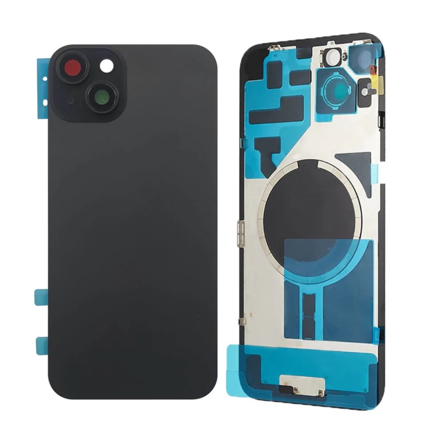 Vitre Arrière iPhone 15 Plus Noir Assemblée avec Logo.