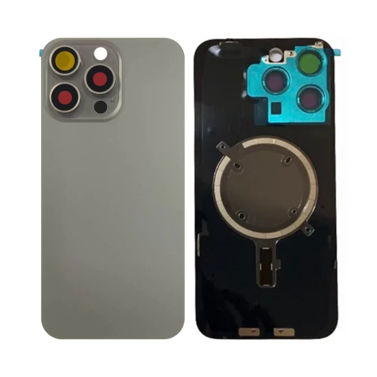 Vitre Arrière iPhone 15 Pro Max Titane Naturel Assemblée avec Logo.